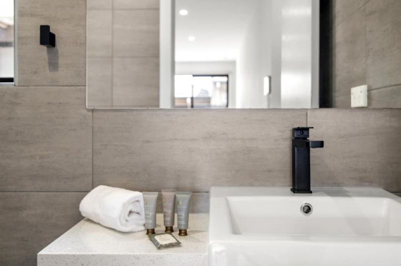 Upstairs, two well-sized bedrooms include a double bed in one room and two single beds in the other, each complete with blackout blinds to ensure a restful night. Both rooms are serviced by split-system heating and cooling for year-round comfort. Two modern bathrooms with sleek finishes add to the overall ease of living, while a separate laundry includes a washing machine and dryer.